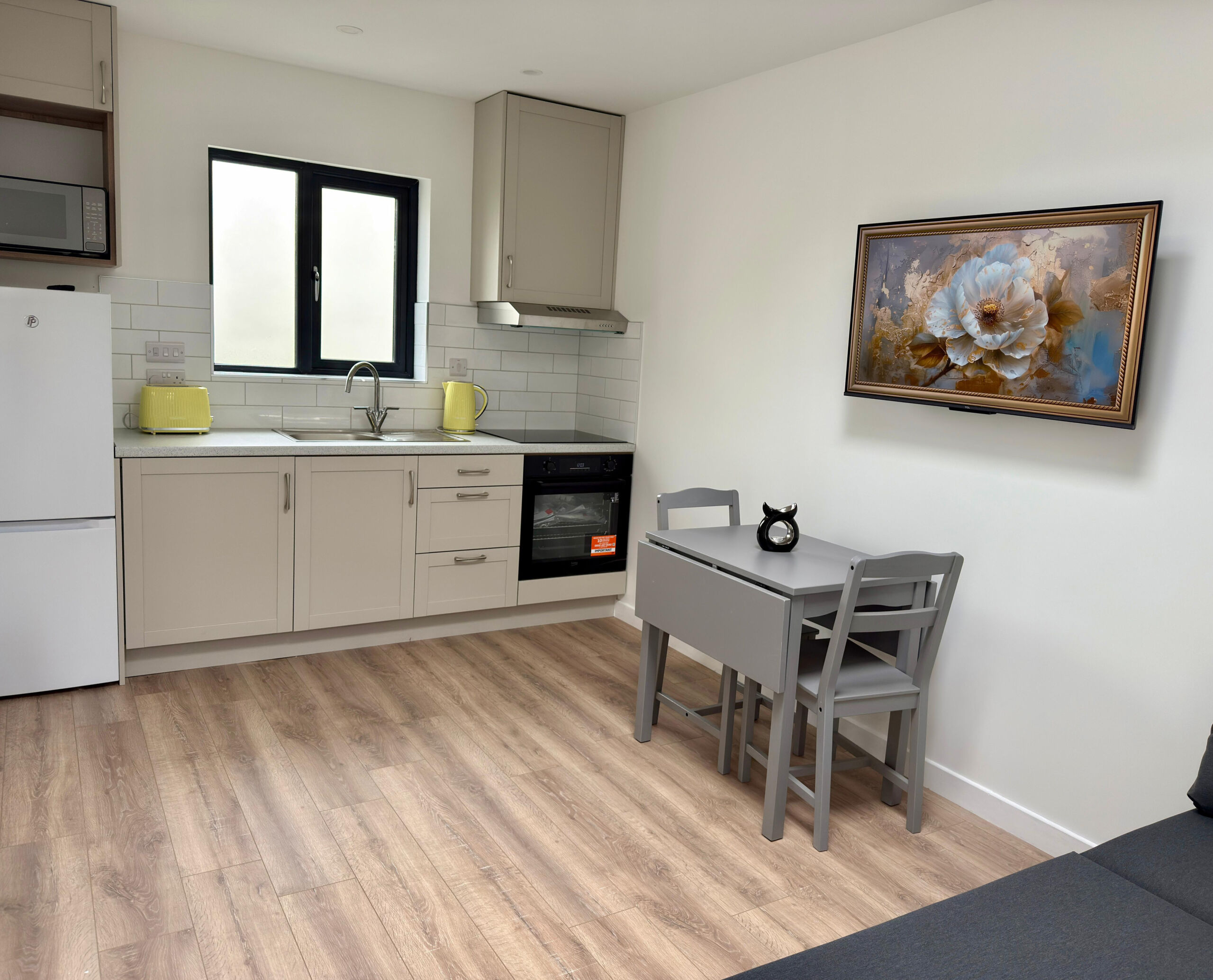 Fully installed plumbing throughout, serving all kitchen, bathroom, and utility needs. Complete electrical fit-out with sockets and lighting in every room, including three kitchen downlights (spotlights) and two external lights. Electric oil-filled radiators are also included for efficient heating.